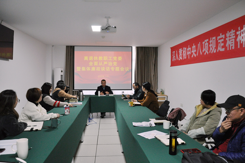 11月24日下午,离退休教职工党委在逸馨楼202会议室召开全面从严治党暨集体廉政谈话专题会议。会议由党委书记蔡纪忠主持,全处工作人员参加。