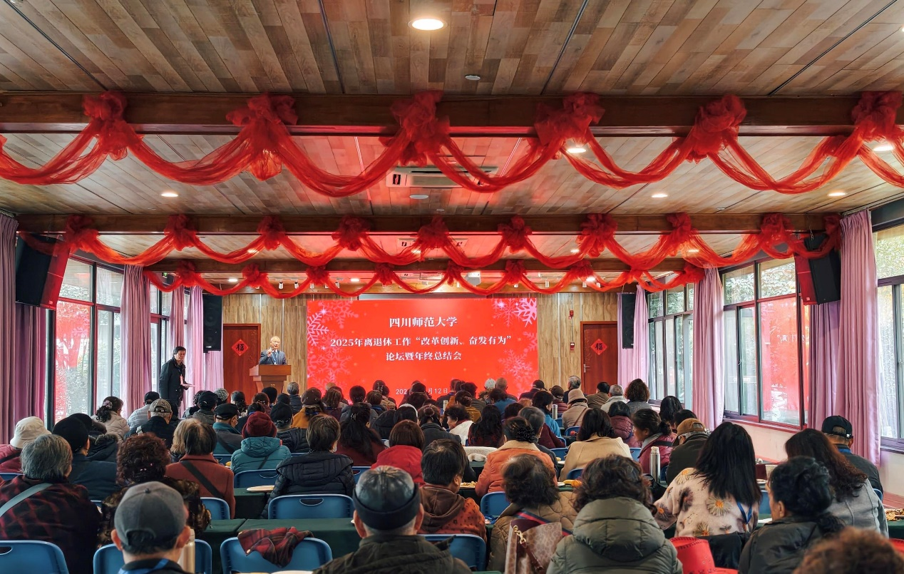12月12日,离退休工作处在锦江区三圣乡举办2025年离退休工作“改革创新 奋发有为”论坛暨年终总结会。会议旨在传达学校第七次党代会精神,以高质量离退休工作助推创新型一流师范大学建设。离退休工作处班子成员、党支部书记及委员、行政组长、活动队长及全处工作人员等100余人参会,会议由离退休工作处副处长李晓斌主持。