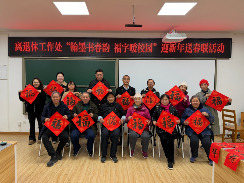 “无联不成春,有联春更浓。”在2026年即将来临之际,为传承中华优秀传统文化,厚植校园文化底蕴,让全校教职工感受传统节日的氛围,12月30日,离退休工作处在狮子山校区逸馨楼201室开展“翰墨书春韵 福字暖校园”迎新年送春联活动,离退休教职工党委书记、离退休工作处处长蔡纪忠,党委副书记、纪委书记向富国与老同志一道,积极参与书写活动。